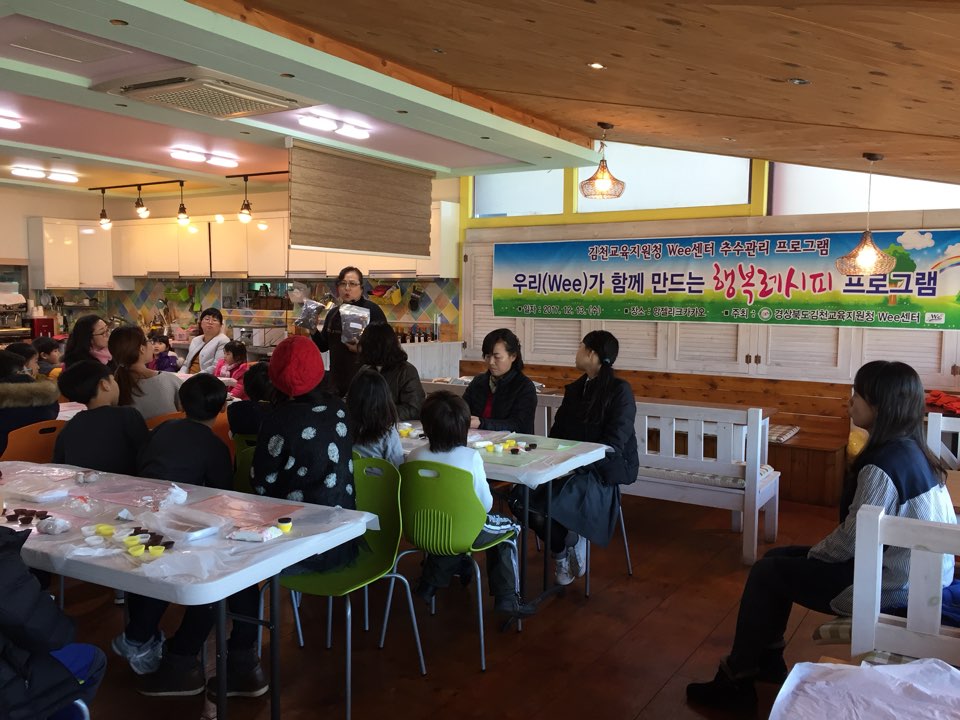 | 경상북도김천교육지원청(교육장 신정숙) Wee센터에서는 12월 13일(수) 한해동안 상담을 받은 학생들 및 가족을 대상으로 “우리(Wee)가 함께 만드는 행복 레시피”프로그램을 운영해 큰 호응을 얻고 있다. Wee센터 상담을 통해 심리적인 어려움을 해소하고 상담효과의 지속과 학생들 스스로 자신의 행복을 찾아갈 수 있도록 마련한 “우리(Wee)가 함께 만드는 행복레시피” 프로그램은 가족 및 또래친구들과 함께 ‘나랑 너랑 우리랑’프로그램과 Wee센터 협약기관인 앙젤리크 카카오에서의 달콤한 초콜릿 만들기, 서로에게 고마움을 표현하는 편지쓰기 시간을 가져보았다.