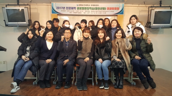| 교육부가 주관하고 한국전문대학교육협의회가 시행하는 ‘2017년 전문대학 글로벌 현장학습 사업’의 결과발표회가 국제화센터(센터장 이세훈) 주관으로 12월 13일 학내 테크노아트관 4층에서 개최되었다.