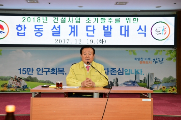 김천시(시장 박보생)는 19일, 2층 회의실에서 내년에 시행할 각종 건설사업의 조기발주와 지역경제 활성화를 위한“2018년 건설사업 조기발주 합동설계단”발대식을 가졌다.