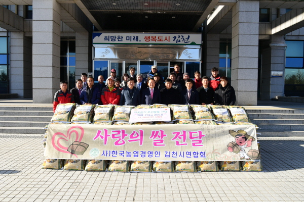 |  | | | ⓒ 김천내일신문 | | (사)한농연 김천시 연합회(회장 육광수)는 12월20일 관내 독거노인, 불우이웃 등에게 전달해 달라며 사랑의 쌀 300포(20kg) 싯가 1,200만원 상당을 김천시에 기탁하여 미담이 되고 있다. 육광수 회장은 “비록 작은 정성이지만 소외되고 힘든 이웃들에게 훈훈한 정이 전달되기를 바란다.”고 말했다. 박보생 김천시장은 “농업·농촌의 어려운 환경에서도 어려운 이웃을 생각하는 농업경영인들의 따뜻한 마음에 고마움을 전하고”, “현재 농촌은 고령화 문제가 심각한 수준으로 청년 농업인을 육성하고 소득을 보장해주는 정책을 중앙정부와 지방정부가 힘을 모아 적극 추진하여야 한다고 강조했다.” 또한 “우리시에서도 김천농업의 새로운 활력을 찾기 위해 김천포도 수출지원단을 운영하는 등 수출농업 행정을 적극 추진하겠다고 하였다.” 시청 전정에서 기증하는 사랑의 쌀은 읍면동별 독거노인과 소외계층 등을 대상으로 농업경영인과 관계공무원이 함께 전달할 계획이다. |