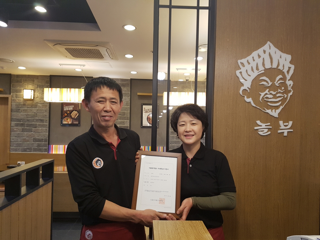 | 김천시(시장 박보생)에서는 지난 12월 6일 율곡동 놀부보쌈부대찌개혁신점(대표 한광희)이 식품의약품안전처가 인증하는 음식점 위생등급제에서 김천시 처음으로 ‘우수’ 등급을 획득했다고 밝혔다.