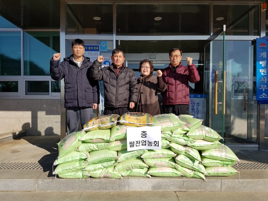 | 12월 21일 개령면 쌀전업농회(회장 하구철)에서는 관내 독거노인 및 어려운 이웃에게 전달해 달라며 직접 농사지은 백미 20㎏ 32포(120만원 상당)를 기탁하여 널리 귀감이 되고 있다. 하구철 개령면 쌀전업농회장은 “추운 연말연시에 나눔의 손길이 필요한 관내 어려운 이웃에게 작으나마 보탬이 되었으면 좋겠다.”고 전했다.