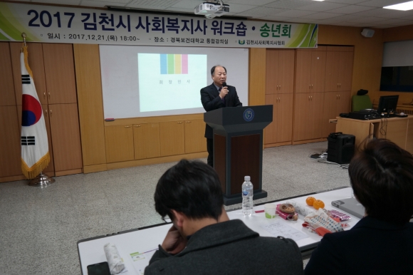 | 김천시사회복지사협회(회장 박선하)는 지난 12월 21일(목) 오후 7시 경북보건대학교 본관 통합강의실에서 박보생 김천시장, 김응규 경상북도의회의장, 박선하 회장과 사회복지사등 80여명이 참석한 가운데 “2017년 김천시사회복지사 워크숍 및 송년회”를 개최하였다.