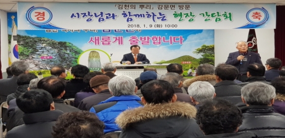 |  | | | ⓒ 김천내일신문 | | 박보생시장이 민선6기 임기를 5개월여 앞두고 있는 가운데 지난1월9일부터 감문면을 시작으로 읍면동 순방을 오는 19일까지 9일간의 일정으로 현장간담회에 들어갔다. 첫째날인 감문면 현장간담회에서는 면 지역 숙원사업과 민원해결 등 이동형 감문면장으로부터 2018년도 업무보고를 받았다. 지역주민으로부터 해결되지 못한 사업, 민원문제와 관련하여 간담회를 진행했다. 감문면은 지난해 사업비31억여원을 투입하고 2018년도는 91억여원으로 사업비가 대폭 증액되어 주민숙원사업 분야에 대한 원만한 민원행정을 처리하고 있다는 주민들의 입소문이 나돌았다. 한편 참석한 일부 지역주민들로부터는 시장님 올해 큰 뜻을 가지고 있다는 말들을 다수가 표현을 하고 그 큰 뜻을 성취하기를 기원한다고 말하고 있다. 이에 박시장은 시민들 사이에 그러한 말들을 많이 듣곤 합니다만 저 자신은 출마의사를 말 한적이 없다는 말을 내 비 추어면서 국회의원직에 출마를 한다면은 오는2월13일 사퇴를 해야 한다는 말을 하고 상황을 살펴보면서 결정하겠다는 여운을 남겼다. |  | | | ⓒ 김천내일신문 | | |