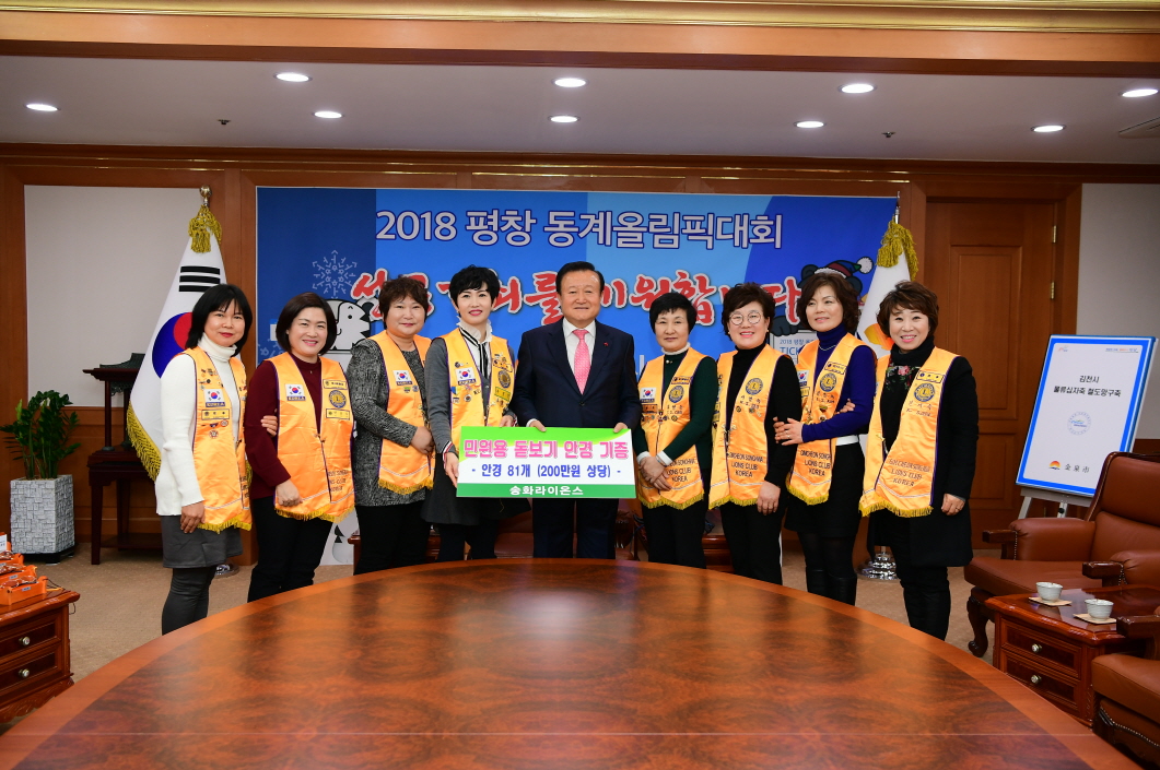 2011년에 결성된 김천 송화라이온스(회장 우지연)는 시각장애인협회와 MOU협약을 체결하여 시각장애인을 위한 다양한 봉사활동을 하는 등 평소에도 지역주민을 위한 나눔활동을 솔선수범하여 실천하고 있는 여성단체로 “평소 시력이 불편한 민원인들이 돋보기를 사용하여 편리하게 민원서류를작성할 수 있도록 송화라이온스 회원들이 정성을 모아 민원용 돋보기안경 81개(200만원상당)를 준비했다.”고 말했다.