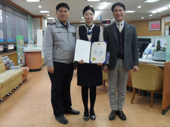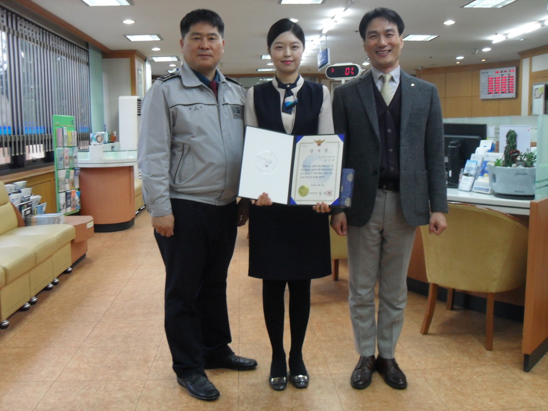 수상자 박지연 계장은 12월15일 고객이 결혼자금으로 현금 거래시 할인을 받을 수 있다고 하면서 현금인출을 요구하는 행동이 불안한 기색을 보여 사회초년생인 젊은 여성고객을 대상으로 한 보이스피싱이 의심되어 다각적인 질문과 감성적인 고객 응대로 보이스피싱임을 확인하고 112에 신고함으로서 고객의 소중한 재산을 보호할 수 있었다.
