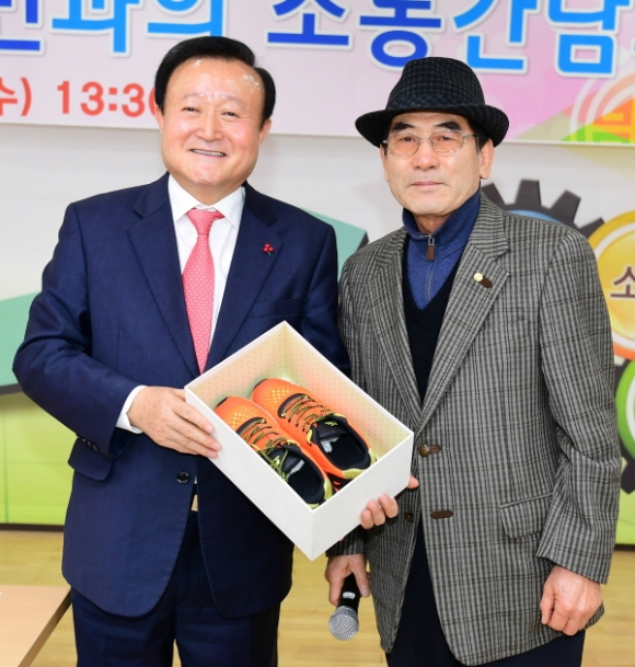 |  | | | ⓒ 김천내일신문 | | 민선6기 임기를 5개월여 앞두고 있는 가운데 박보생시장은 22개 읍면동 마지막 업무보고를 받기위해 순방에 울랐다. 순방 이틀째 대신동에서 업무보고에 이어 주민간담회가 열렸다. 대신동 노인회 박종철 회장은 황금개띠의 해 무술년을 맞이하여 박시장에게 황금색을 띠는 운동화를 선 듯 내놓았다. 선물로 알았던 운동화는 임기 말까지 산적해 있는 현안사업들 마무리를 위하여 부지런히 발로 뛰라는 신발 이었다, 3선의 임기 중 이런 좋은 선물을 받기는 처음이고 의미가 깊은 물건이었을 것이다. 한편, 읍면동 순방 때 마다 지역주민들은 국회의원 출마에 많은 관심을 두고 대망의 꿈을 펼쳐보라는 목소리가 가일 층 높아지고 있다. 새 신발 운동화를 발끈 조이고 뛰어보라는 채찍질하는 신발 일 수도 있다. 읍면동 순방은 오는 19일 지좌동을 끝으로 종료가 된다. 사정이 이러한 가운데 박시장은 2월1일 쯤 모든 상황을 마무리한다는 소문도 무성하게 나돌고 있다. |
