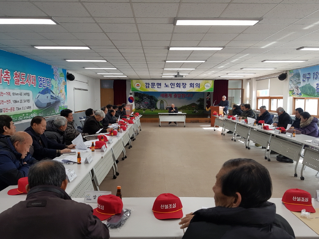 1월 25일 면사무소 회의실에서 진행된 총회에는 32개소 노인회 회장님과 김응규 도의회 의장, 이동형 감문면장, 김세운 시의회 부위원장, 신형철 감문 농협장, 박세환 감문파출소장, 임덕수 대한노인회 김천시지회 사무국장 등이 참석했다. 회의에서는 2017년 결산보고와 2018년 새로 신임된 각 마을 경로당의 회장 소개와 대한노인회 김천시지회 공지사항과 감문면사무소의 공지사항을 전달하였고 2018년 임원(감사) 선출, 경로당 운영방안 등 논의를 하였다.