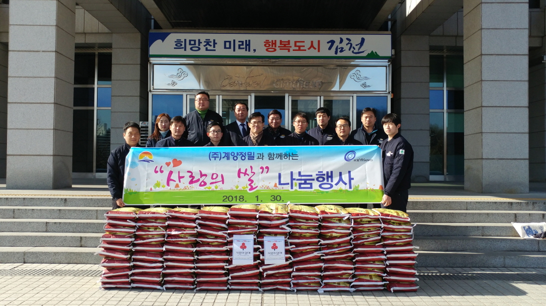 | 계양정밀(대표이사 정병기)은 지난 1월 30일 관내 독거노인 및 가정위탁아동을 위한 백미를 김천시에 전달하였다.