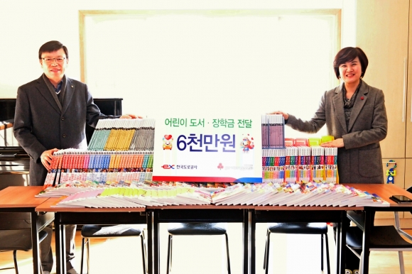 | 한국도로공사(사장 이강래)는 2월 1일 아동복지시설 어린이와 저소득 가정 중·고등학생들의 교육지원을 위해 도서 1만권(3천4백만원 상당)과 장학금 2천6백만원을 경북 사회복지공동모금회에 전달했다고 밝혔다. 이는 도로공사 직원이 1권의 도서를 기부할 때마다 도로공사가 어린이 도서 1권 및 장학금 5000원을 적립하는 방식의 ‘도서매칭 프로그램’을 통해 마련됐다. 도서는 김천 덕곡지역아동센터를 비롯한 전국 10개 시·군·구 소재 아동복지시설 18곳에, 장학금은 전국 11개 시·군·구 거주 저소득가정 중·고등학생 52명에게 전달된다.