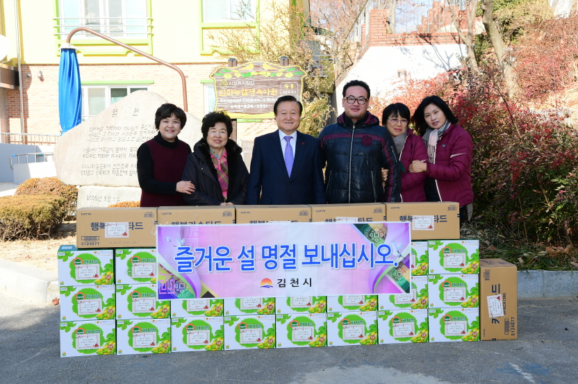 | 김천시는 우리의 고유 명절인 설을 맞아 주변의 어려운 이웃을 돌아보고 따뜻하고 인정 넘치는 명절 분위기 조성을 위해 2월 5일부터 22개 읍면동 저소득가구에 설위문품 배부 및 삼애원, 임마누엘영육아원, 직지사노인요양원 등 집단거주지역과 장애인․노인․아동시설, 정신요양․사회복귀시설 51개소를 방문하여 생활인 및 관계자들을 위문 격려하였다. 아울러 김천시 관내 유관기관과 김천시청 각 실과소 및 읍면동에서도 지역 내 독거노인, 장애인 등 어렵게 살아가는 소외이웃들을 위문 방문하였고, 각계각층에서도 백미, 생활용품 등을 기탁하여 따뜻한 설맞이가 되도록 위문활동에 동참하였다.