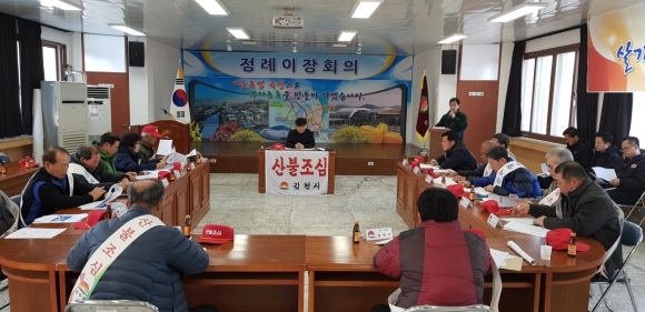 또한 지난 2월 7일(수) 이장회의를 소집하여 산불예방 교육을 실시, 주기적인 마을 앰프 방송과 자체 산불예방 현수막을 게첨하도록 당부하였으며, 산불감시원을 활용하여 산불취약 구간에 사각깃발 부착과 적극적인 순찰활동을 지시하였다. 그리고 만일의 사태에 대비하여 화재 진압 장비들을 점검·정비하여 즉각 출동 및 초동진화 태세 준비를 마쳤다.