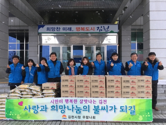 | 김천시청 공무원 봉사동아리(회장 윤장원) 우함나회가 지난 2월 12일 김천시청 전정에서 설 명절을 맞아 소외 계층 50가구에 쌀과 라면 등 300만원 상당의 위문품을 전달하는 행사를 가졌다.
