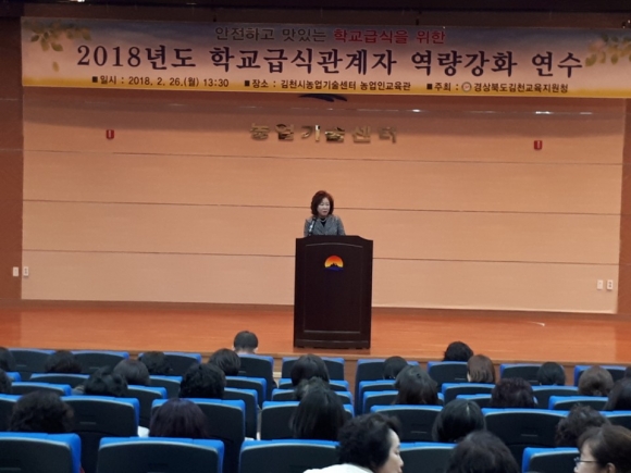 | 경상북도김천교육지원청(교육장 신정숙)은 2월 26일 김천시농업기술센터 농업인관에서 공립단설유치원, 초․중․고등학교 조리사, 조리원 등을 대상으로 개학을 앞두고 안전하고 위생적이고 맛있는 행복 김천학교급식을 위한 위생·안전의식 강화와 함께 식중독 사고를 사전에 예방하기 위한 업무능력의 향상과 전문 역량을 강화하기 위해“2018 학교급식 관계자 위생·안전역량강화연수”를 실시했다.
