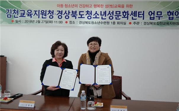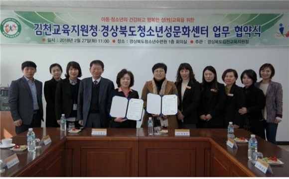 |  | | | ⓒ 김천내일신문 | | 경상북도청소년성문화센터(센터장 신봉기)는 지난2월 27일 경상북도청소년수련원 1층 회의실에서 김천교육지원청(교육장 신정숙)과 아동‧청소년 성교육 활성화를 위하여 업무협약(MOU)을 체결했다. 양 기관은 아동·청소년 성교육 활성화를 위하여 유기적인 협력체계를 구축하고, 안전하고 건강한 학교 만들기에 적극 노력하며 협약 내용에는 ① 청소년 특성에 맞는 다양한 매체를 활용한 시청각적 참여형 성교육 프로그램 지원, ② 학생들의 올바른 성지식 습득 및 그릇된 성문화에 대한 비판적 안목 배양, ③ 효율적이며 원활한 교육을 위한 환경 조성 및 자문 등을 담고 있다. 경상북도청소년성문화센터 신봉기센터장은 인사말을 통해 “양 기관이 상호 협력함으로서 학생들이 유해환경을 통해 접하게 되는 그릇된 성개념을 벗어나 건강한 성가치관을 정립하게 되는 계기가 되고, 이에 경상북도청소년성문화센터는 체험관성교육, 동극을 통한 성폭력예방프로그램 및 학부모성교육을 적극 지원함으로써 모든 학생들이 안전하고 행복한 학교 만들기의 밑거름이 될 것으로 기대한다”고 말했다.