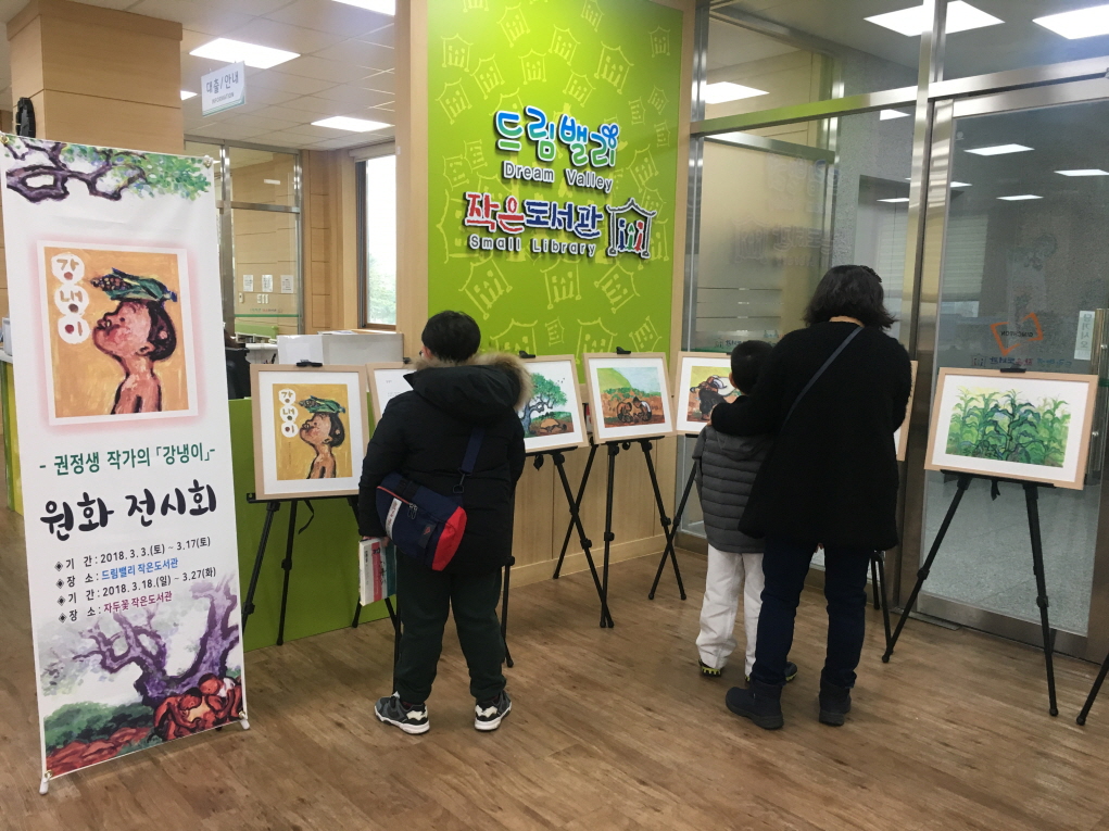 《강아지똥》으로 유명한 권정생 작가의 「강냉이」 그림책은 권정생 작가가 초등학생 시절 썼던 시를 그림책으로 엮은 도서로, 어린 시절 겪은 전쟁의 경험과 남겨두고 온 강냉이에 대한 어린 마음을 사투리와 섬세한 그림으로 표현해 낸 책이다. 원화전시는 드림밸리 작은도서관에서 3월 3일부터 17일까지, 이어서 자두꽃 작은도서관에서 18일부터 27일까지 사계절 출판사의 지원으로 전시되어 작은도서관을 찾는 시민들에게 선보일 예정이다.