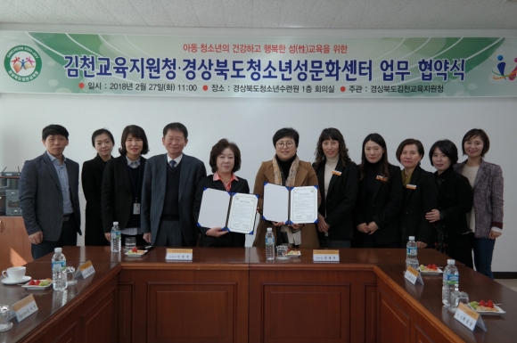 | 김천교육지원청(교육장 신정숙)은 2018년 2월 27일(화) 11시 경상북도청소년성문화센터 1층대회의실에서 경상북도청소년성문화센터(센터장 신봉기)와 아동·청소년 성교육 활성화를 위한 업무협약을 체결하였다.