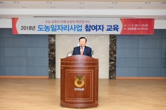 |  | | | ⓒ 김천내일신문 | | 김천시(시장 박보생)에서는 2월28일 김천농협 4층 대회의실에서 관내 농가주 및 농촌일자리참여자 200여명을 대상으로 도농일자리사업 참여자 교육을 실시했다.
