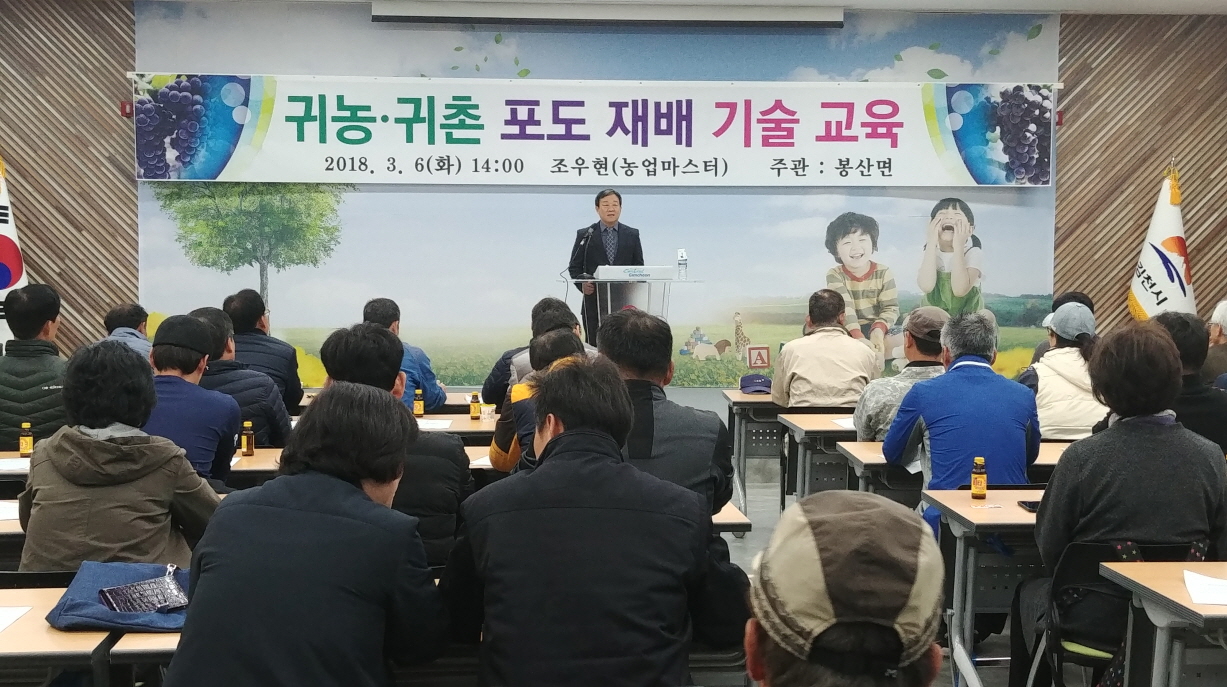 이날 교육은 포도 농업마이스터 조우현(봉산면 인의리)의 강의로 3시간 동안 포도 재배기술 및 품종별 재배요령, 귀농인들과의 질의응답 순으로 진행하여 영농기술 정보 부족으로 정착에 어려움을 겪고 있는 귀농인들에게 유익한 정보를 제공하였으며, 추후 체험활동을 통한 포도재배 기술 습득 현장 컨설팅을 지속적으로 실시하기로 하였다.