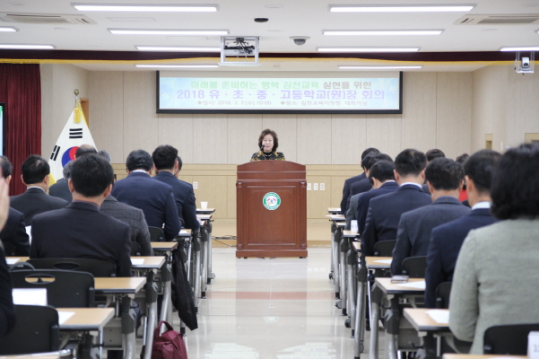 이날 회의에서는 김천시 관내 각급 학교(원)장 60여 명이 참석한 가운데 2018학년도 미래를 준비하는 행복 김천교육 실현을 위한 인성 교육계획 수립, 학교 안전계획 수립, 생활지도, 학교 감염병 예방 및 위생관리 강화, 2018학년도 주요 행사 계획 등에 대하여 안내하고 의견을 나누었다. 또한 청렴을 생활화하여 신뢰받는 김천교육 구현에 앞장설 것을 각급 학교(원)장 모두가 굳게 다짐하였다.