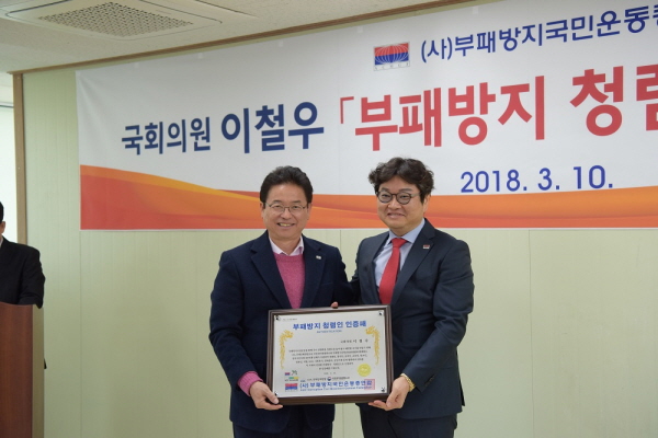 |  | | | ⓒ 김천내일신문 | | 경북도지사 선거에 나선 자유한국당 이철우 의원이 국민권익위원회 소관 (사)부패방지국민운동총연합으로부터 ‘대한민국을 빛낸 진정한 청렴인’으로 선정돼 ‘부패방지청렴인인증패’를 받았다.