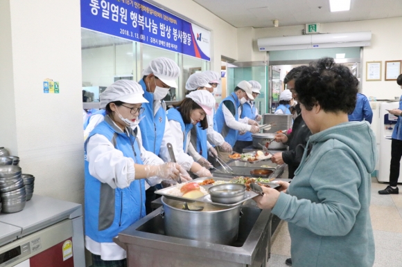 | 민주평화통일자문회의 김천시협의회(회장 엄태영)은 3월 13일 김천시장애인복지관(관장 박선하)을 찾아 장애인을 위로 격려하고 ‘행복나눔 밥상’을 실시하였다. 김천시협의회는 잡곡밥, 한우탕국, 돈육갈비찜으로 정성껏 식단을 준비하였으며, 회원들은 배식과 식사수발을 도왔다.