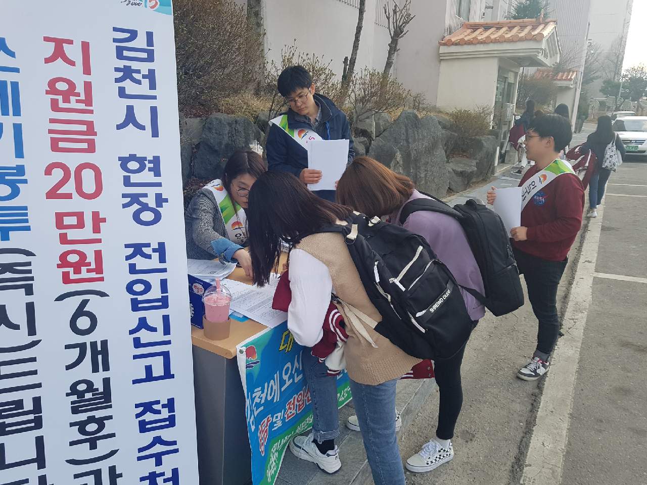 3월 13일부터는 김천대학교 여자기숙사(부곡우방타운)에서 현장전입반을 운영하고 있다. 3월 13일 첫날은 학생들의 경계로 한명의 전입신고도 받지 못하였으나 직원들의 적극적인 홍보와 기숙사 사감선생님들의 도움으로 3월 14일 두 번째 날은 8명의 전입신고를 받았다. 기숙사 신입생 300명중 8명은 아주 적은 숫자이지만 도춘회 대곡동장은 실망하지 않고 3월 한달동안 학생들의 수업이 일찍 끝나는 화, 수요일마다 현장전입반을 지속적으로 운영할 계획이다.