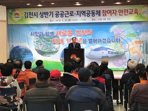 | 김천시는 3월 20일(화) 14:00부터 김천시청 3층 강당에서 상반기 공공근로 및 지역공동체일자리사업 참여자 82명을 대상으로 안전교육을 실시했다.