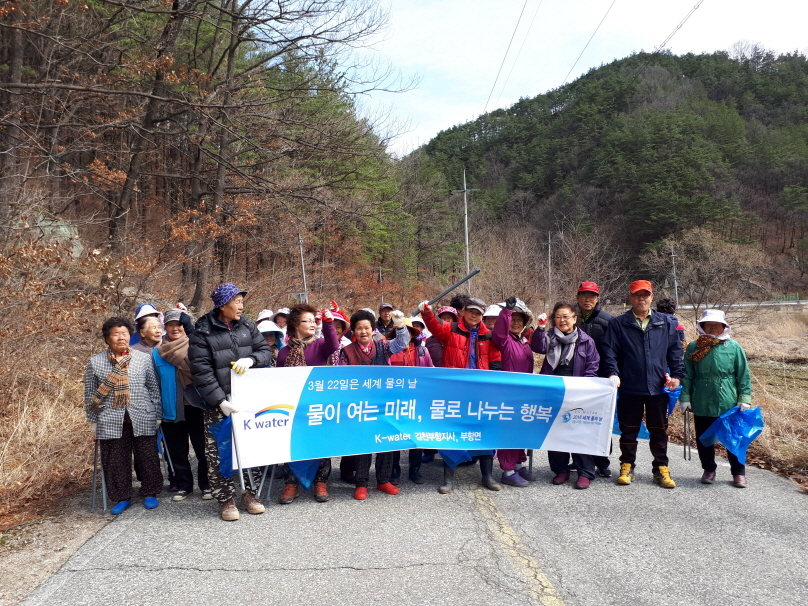 | 김천시 부항면(면장 안재석) 주민들과 단체에서는 3월 20일, 21일 양일간 봄맞이 대청소 및 『2018년 세계 물의 날』기념 댐 주변 자연보호활동을 실시했다.