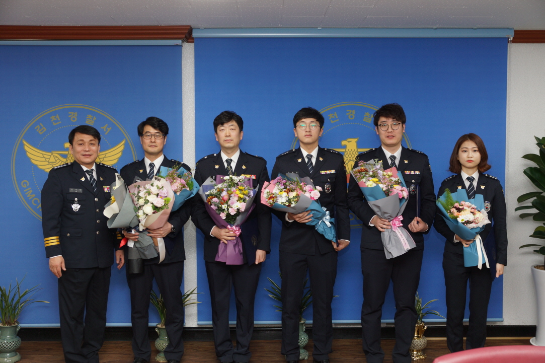 | 김천경찰서에서는 3월 20일 서장실에서 여성청소년과 최정훈 경위, 경비교통과 유영민 경위, 북부파출소 김정엽 경장, 율곡파출소 김영규 경장, 생활안전과 배지윤 경장에 대한 승진 임용식을 가졌다.