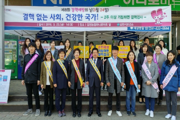 |  | | | ⓒ 김천내일신문 | | 김천시는 제8회 결핵 예방의 날(매년 3월 24일)을 맞이하여 지난3월 23일 김천 농협하나로마트 일대에서 결핵 예방 및 관리의 중요성을 알리고 결핵에 대한 인식 개선을 위한 결핵 예방 캠페인을 실시하였다.