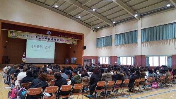 올해 새로 부임하신 교장 선생님을 시작으로 전 교직원 소개를 하였으며, 교장 선생님의 경영철학 및 2018학년도 교육지표, 2015 개정 교육과정, 학교 폭력 및 생활 안전 교육, 각 부별 교육활동 및 추진현황에 대한 안내 및 실적 설명이 있었다.