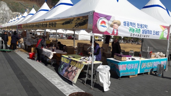 | 또한 , 공무원과 더불어 귀농교육 수료자 중심으로 결성된 ‘김천시귀농연합회’ 회원들이 자매결연 도시인 영덕군 대게축제장에도 참가하여 본인들이 생산한 농산물 및 가공품을 홍보하고 판매하였으며, 100여건의 귀농귀촌 상담과 더불어 귀농연합회원들의 귀농·귀촌 사례를 통해 도시민들의 뜨거운 관심을 받았다.