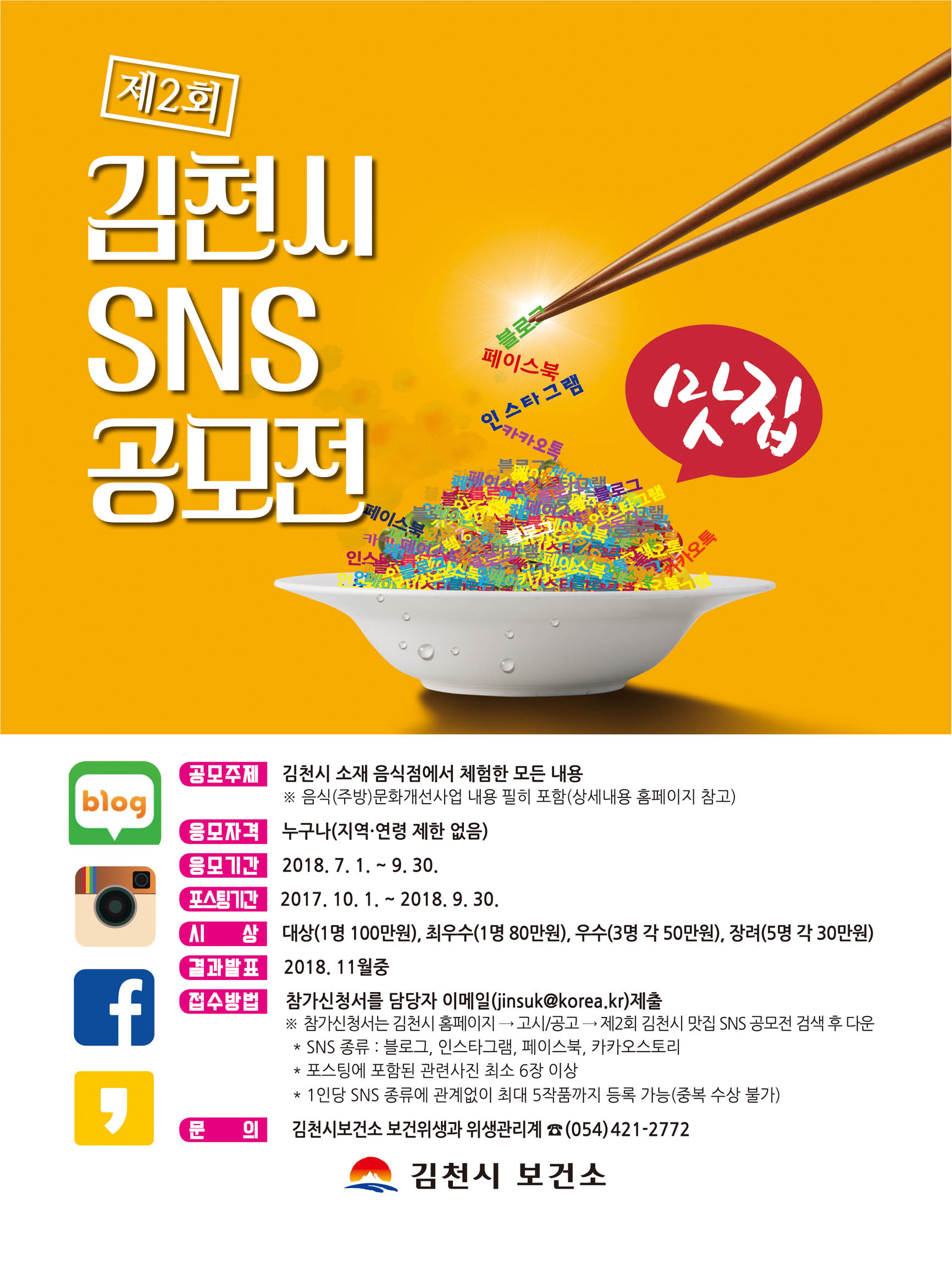 김천시 맛집 SNS 공모전 응모방법은 김천시 소재 맛은 기본이고 위생적이고 깔끔한 음식점 또는 맛과 멋을 겸비한 음식점 방문후기에 대한 내용과 사진을 개인 SNS에 게시하고 참가신청서에 해당 게시물(응모작)의 URL 링크등록 후 2018. 7. 1 ∼ 9. 30까지 신청하면 된다.