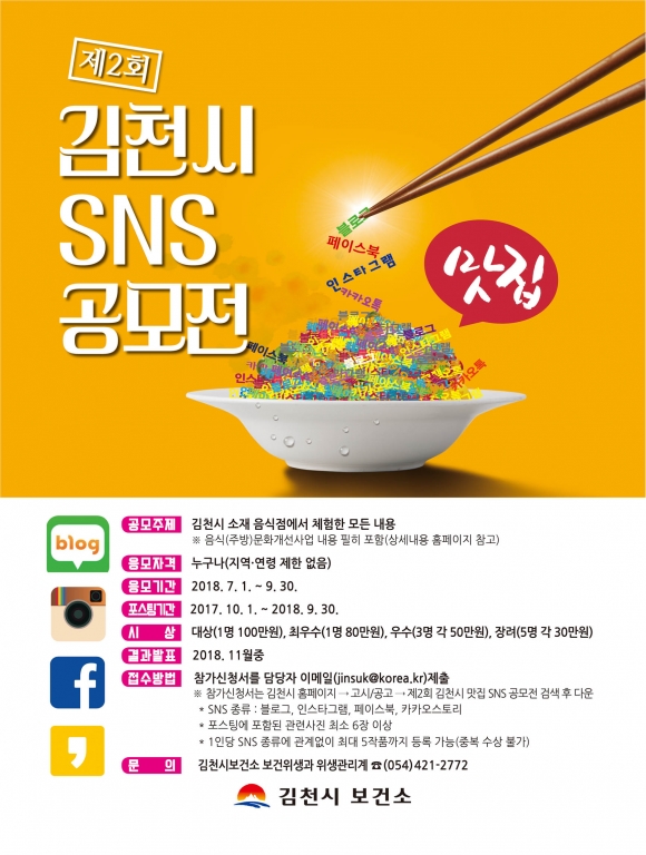 | 김천시(시장 박보생)는 작년에 이어 음식문화 및 주방문화 개선사업의 일환으로「제2회 김천시 맛집 SNS 공모전」을 개최한다고 밝혔다.