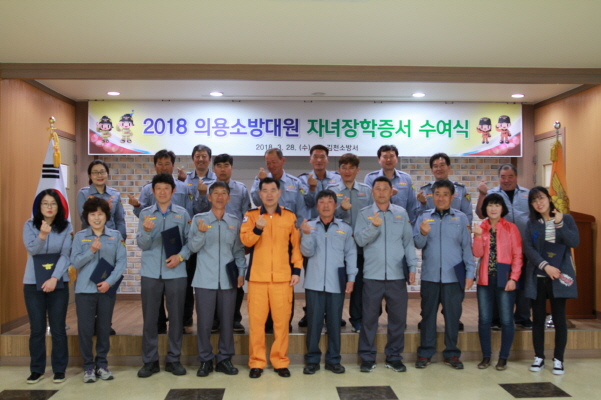 |  | | | ⓒ 김천내일신문 | | 김천소방서(서장 이주원)는 3월28일 소방서 3층 회의실에서 의용소방대원 및 소방공무원 30여명이 참여한 가운데 의용소방대 자녀장학생 장학증서를 수여했다. 이번 자녀 장학금은 “의용소방대 자녀장학금 지급조례”에 의거 의용소방대의 자녀 중 품행이 단정하고 학업 성적이 우수하며 가정 형편이 어려운 경북보건대학교 김영성 학생의 학부모 등 26명을 엄선하여 총 2,500여만원의 장학금을 지급하고 장학증서를 전달했다. 이주원 소방서장은 “화재 등 재난사고 예방과 소외계층에 대한 사회봉사 활동 등 소방행정에 맡은 바 책무를 성실히 수행해 온 대원들의 노고를 격려하였으며, 장학생들이 학업에 더욱 매진해 훌륭한 인격을 갖춘 우수한 인재로 양성되어 국가와 지역사회에 꼭 필요한 사람으로 성장하길 기대 한다”고 말했다. |