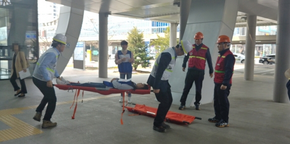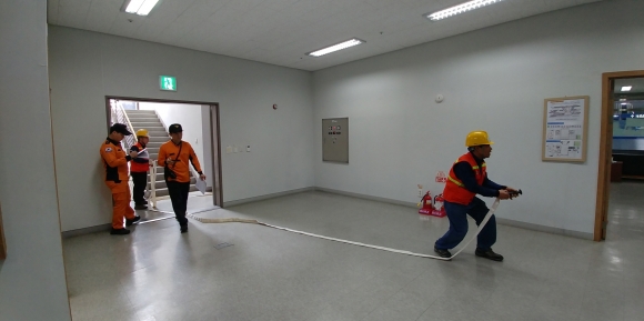 | 중점 훈련내용은 △화재발생 상황부여 △관계자의 화재 전파 및 119신고 △이용객들의 피난대피유도 △소화기 및 옥내소화전을 이용한 초기 화재진압 △부상자 응급처치 및 후송 순으로 실시됐다