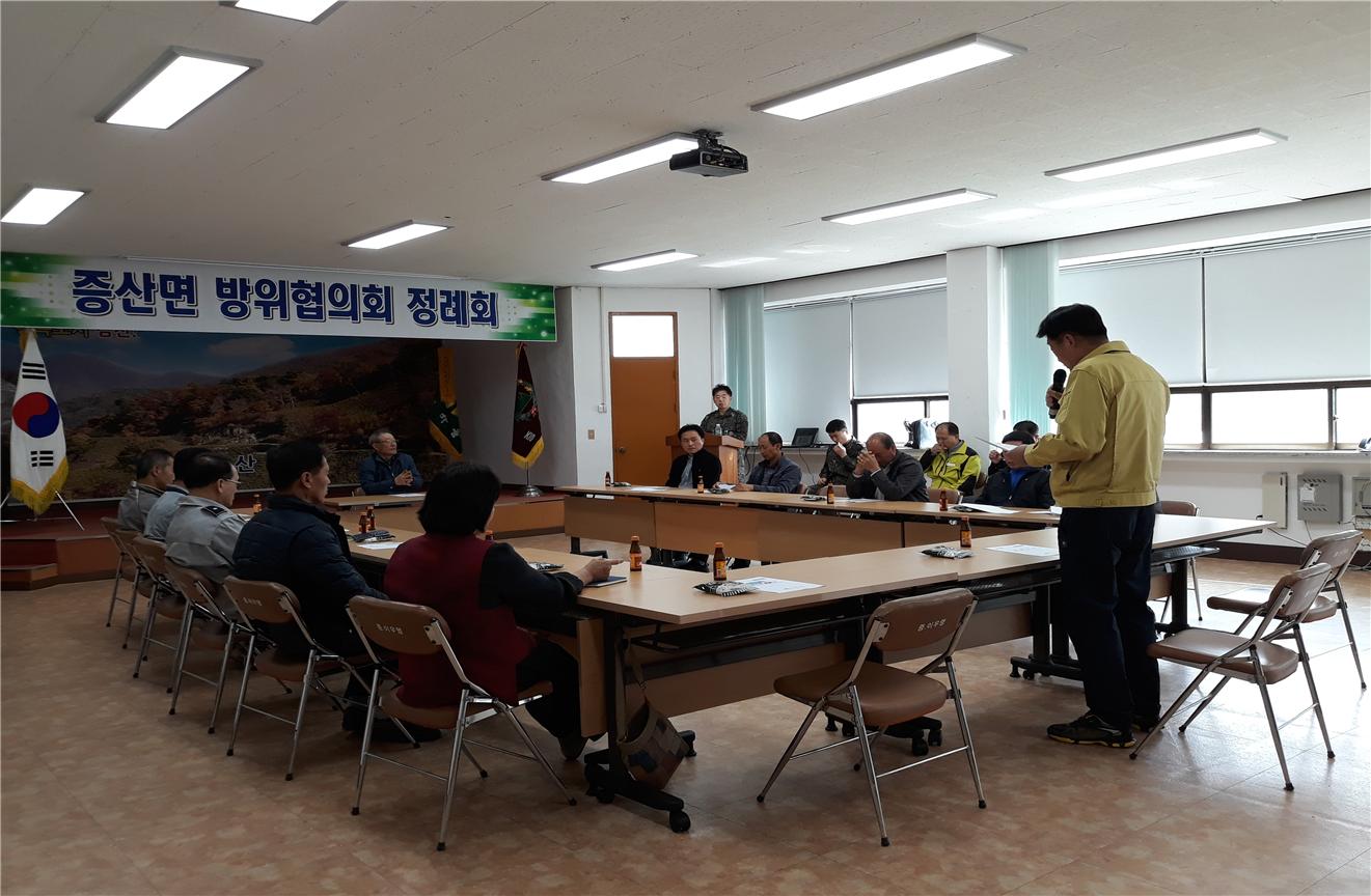 엄수영 증산면장은 산불 없는 증산면을 만들자면 산불예방홍보 및 구제역예방, 15만 인구회복 운동에 적극적인 동참 등 당면현안과 행정사항에 대하여 설명하고 국가 및 지역안보태세를 굳건히 하는데 증산면 방위협의회가 구심점 역할을 하도록 많은 관심과 적극적인 협조를 부탁하였다.