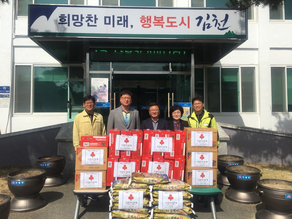 | 사단법인 나눔과 기쁨 김천지부(나눔지도자 김경환 목사)와 김천시청 기독신우회(회장 강연진)는 복지사각지대에 놓인 취약계층에 전달해 달라며 지난 4월 2일 지례권역 맞춤형복지팀을 찾아와 쌀 15포(10kg)와 라면 20상자를 기탁했다.
