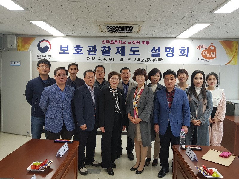 | 법무부 구미준법지원센터(소장 남두화)는 4월 4일(수) 구미 선주초등학교 교직원들을 초청해 보호관찰제도, 위치추적 전자감독 제도, 찾아가는 현장교육으로 실시하고 있는 법 교육 사업, 치료명령제도 소개 등 보호관찰제도 설명회를 개최하였다.