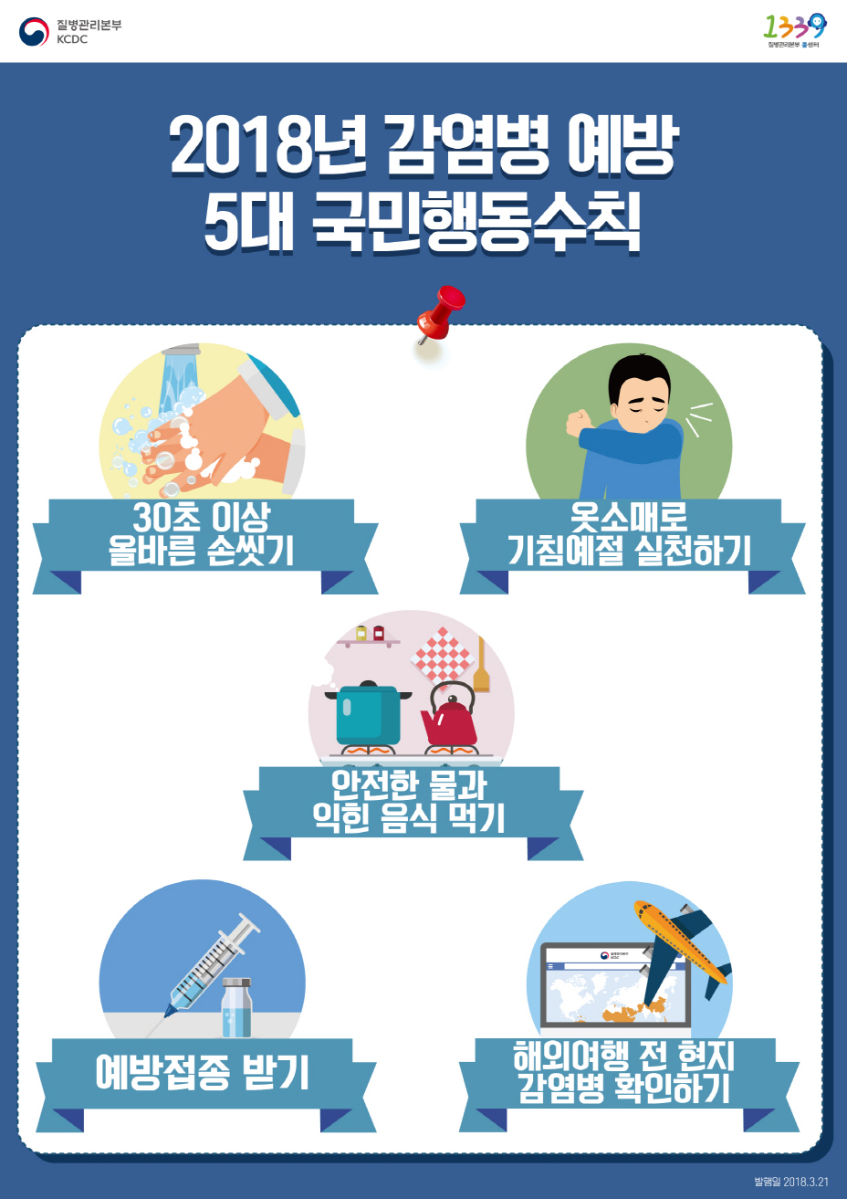 | 김천시(시장 박보생)는 2018년 질병관리본부에서 선정한 생애주기별 관리대상 감염병 예방과 관련해 시민들이 일상생활에서 실천할 수 있는 5대 국민행동수칙 준수를 당부했다.