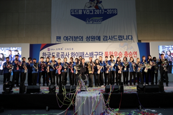 한편, 도로공사 하이패스 배구단은 1970년에 창단한 국내 최초 여자 배구단으로, 2005년 프로 리그 출범 후 3차례 챔피언 결정전에 진출했으나 준우승에 머물렀다. 이후 우승을 위해 2년 전 배유나 선수를, 올해는 박정아 선수를 FA로 영입하고, 외국인 선수 트라이아웃에서 1순위로 이바나 선수를 뽑는 등 전력보강에 힘써 이번 시즌 정규리그에 이어 챔피언 결정전까지 통합 제패하며 첫 챔피언 타이틀을 달게 됐다.