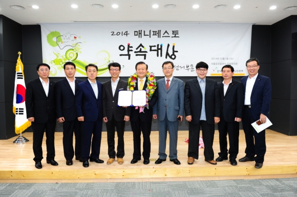 아울러 공약에 대한 직원들의 관심을 환기시키고, 강한 인식을 심어줄 수 있는 교육을 수시로 실시하였다. 그 결과 민선5기를 마무리하는 시점에 2014년‘법률(소비자)연맹’에서 주관하는‘공약대상’을 수상하게 된다. ▶시민들이 중심이 된 새롭게 시작된 공약관리 시는 2014년 새롭게 시작된 민선6기에서 이전의‘시민중심의 공약관리’체계에 전문성을 기하고자 한국매니페스토실천본부와 업무협약을 체결하였다. 시민과의 소통부재로 고배를 마셨던 지난 평가를 발판삼아 공약관리에 더욱 심혈을 기울이겠다는 의지였다.