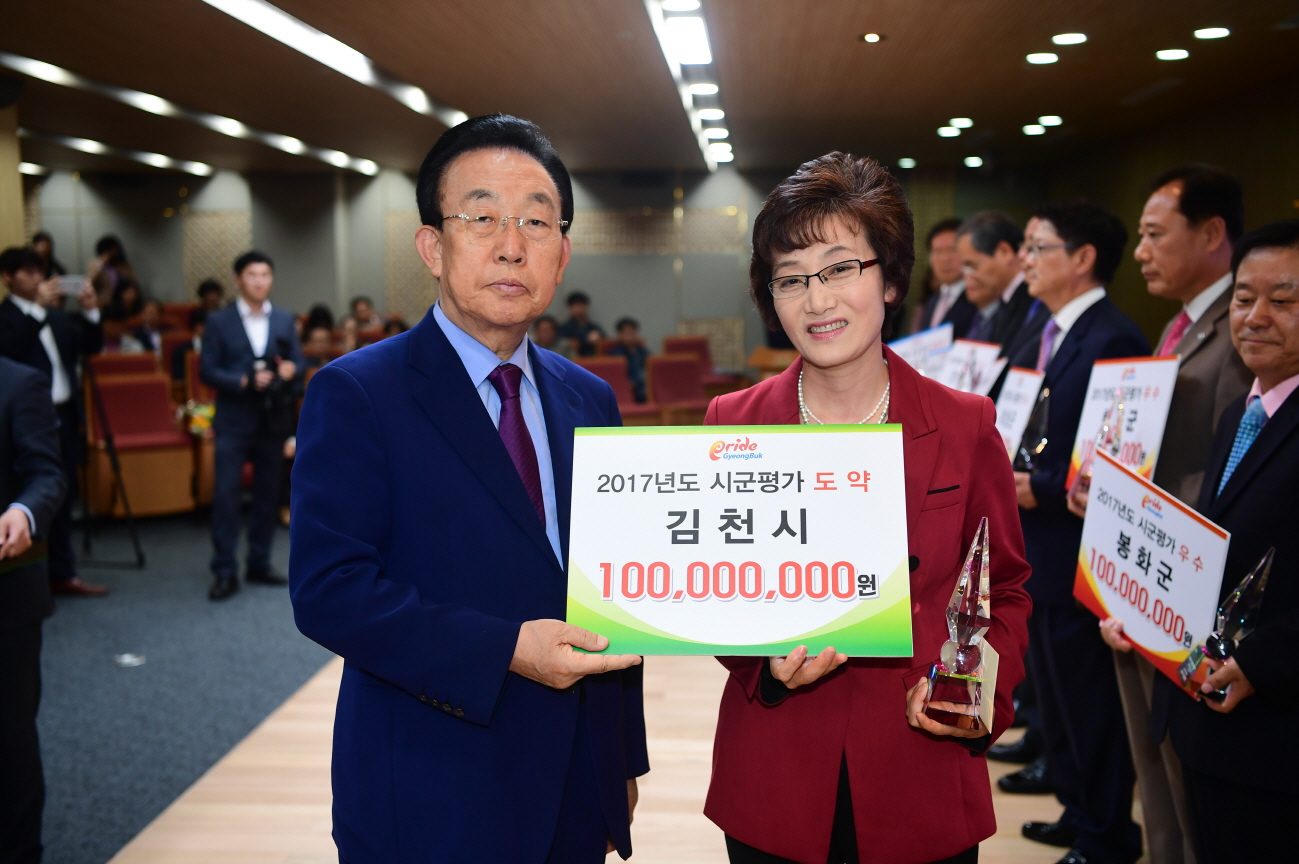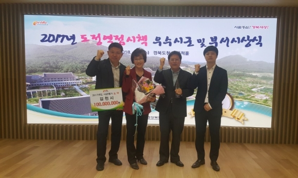 | 김천시(시장 박보생)는 2017년 경상북도 시군평가에서 우수기관으로 선정되어 상사업비 1억원과 포상금 300만원을 수상했다.