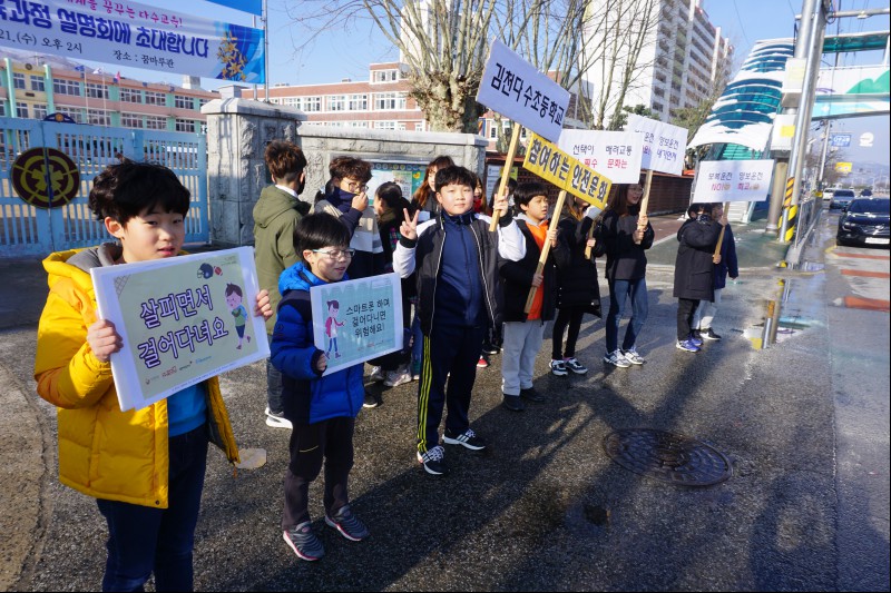 교통안전캠페인은 추운 날씨 속에서 10여명의 학생들과 교직원이 참석하여 등·하굣길 교통안전을 위해 피켓과 플랜카드 등을 활용하여 교통안전사교 예방 홍보활동을 전개하였다.