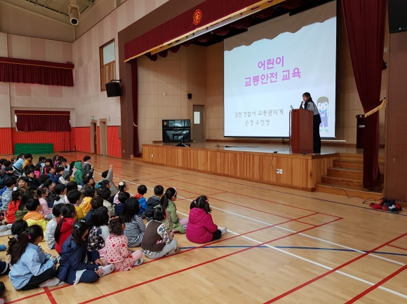 교통안전교육은 김천경찰서 교통관리계 유진영 순경을 초청하여 미래의 꿈나무인 어린이들에게 교통사고의 위험성을 이해함과 동시에 교통질서를 지키는 것의 중요성을 알려 사고를 미연에 방지하려는 안전에 대한 적극적인 태도를 형성하기 위하여 실시하였다.