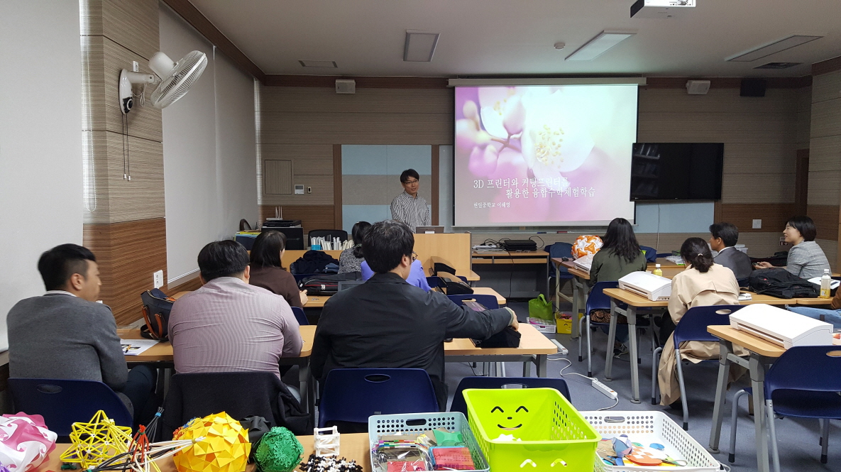 강사인 현일중학교 교사 이해영선생은 3D프린터와 커팅프린터 사용 방법 안내 뿐 만아니라, 교육활동에 적용할 수 있는 다양한 모델링과 검색 사이트를 소개했으며, 그 외 수학체험용 자료로 나무 재료를 이용한 수학체험 교구, 퍼즐류 등도 소개하였다.