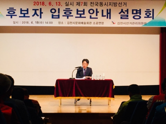 | 김천시선거관리위원회는 제7회 전국동시지방선거에 출마하는 김천시장, 경상북도의회의원 및 김천시의회의원선거의 예비후보자 및 선거사무관계자 등을 대상으로 2018년 4월 18일(수) 오후2시 김천시문화예술회관 소공연장(1층)에서 ‘후보자 입후보안내 설명회’를 개최했다고 밝혔다.