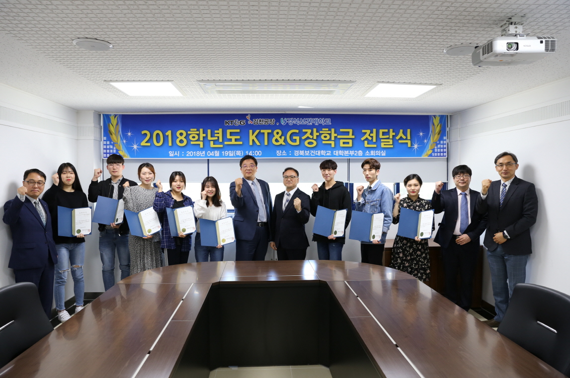 | 경북보건대학교(총장 이은직)과 KT&G 김천공장(공장장 신송호)은 4월 19일(목), 본관 2층 소회의실에서 ‘2018학년도 KT&G 장학금 전달식’을 개최했다.