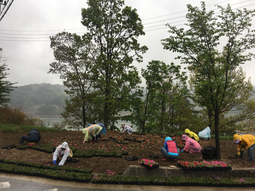 비가 내리는 날씨에도 불구하고 쾌적하고 아름다운 부항면을 만들기 위해 생활개선회 회원 15여명이 참석한 가운데, 지좌리 입구 및 주변 길에 잡초 및 쓰레기를 제거하고 화단을 정비하여 꽃잔디, 페츄니아, 야생화 등 각양각색의 화사한 봄꽃으로 단장했다.